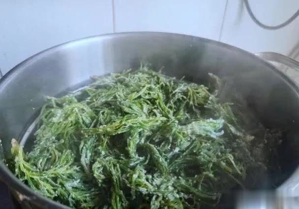 3、再把丝瓜过几遍凉水,用勺子按压出充足的水分,防护炒的时分出水太多,咱们不错看到焯水完以后,丝瓜的热情畸形翠绿。