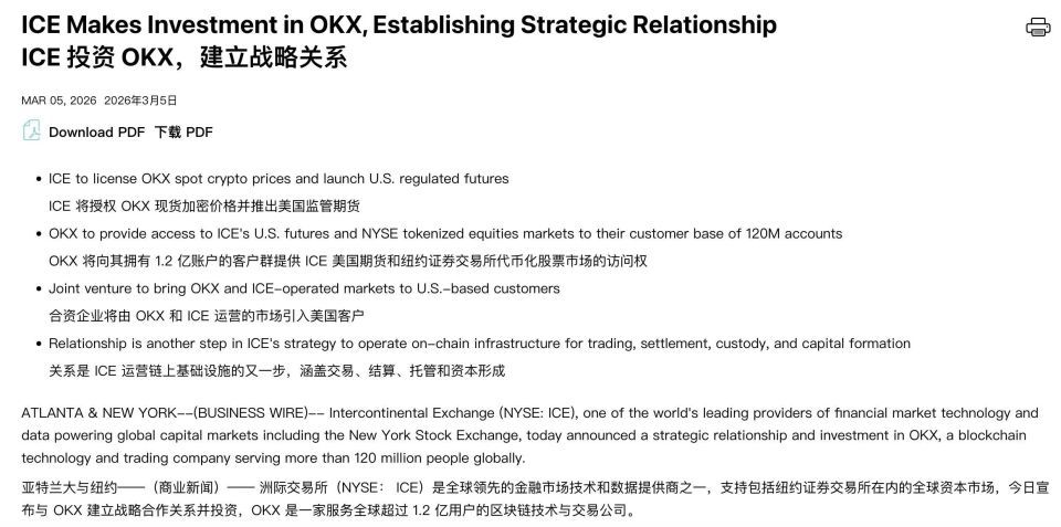 ICE的行为自身就露馅了果然意图。官方新闻稿写的是「ICE Makes Investment in OKX」,是ICE主动发起;「ICE to license OKX spot crypto prices」,是ICE主动采购OKX的现货价钱数据授权。投资方和数据买方,都是ICE。