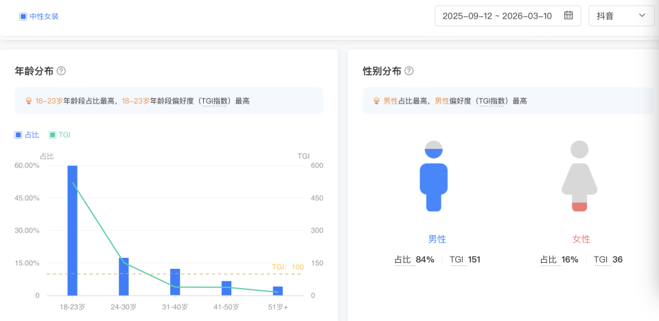 但骨子上,最近半年,在抖音搜索“中性女装”的东谈主中,有84%为男性用户。冒昧,这也意味着,千里闷的男装市场,潜伏着一股快活的渴慕变革的需求。